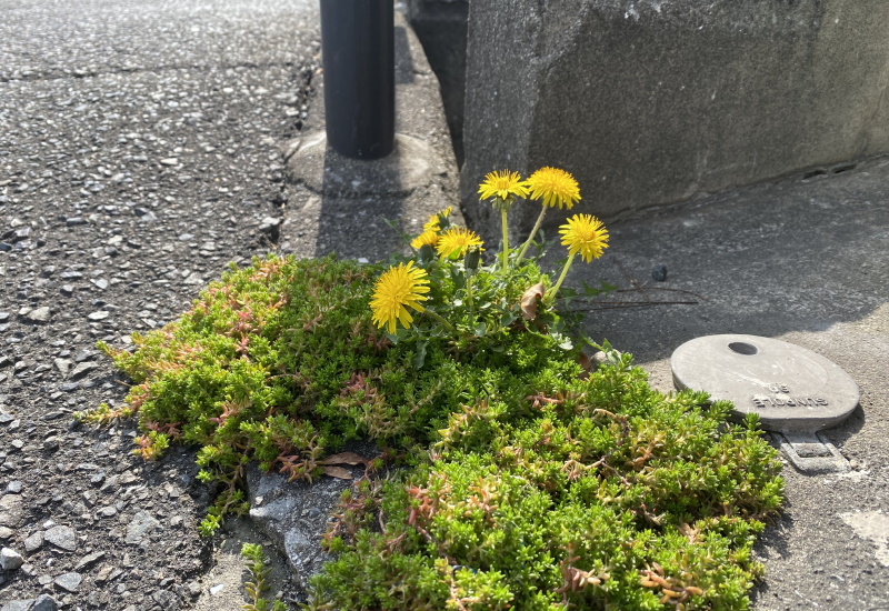 周りの多肉植物も自然と自生し、タンポポと一緒に小さな隙間に共存している姿が微笑ましく、