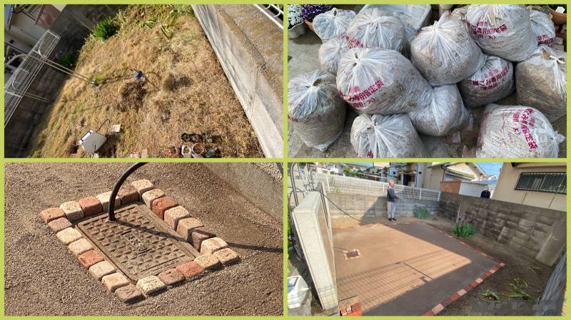 マンションの専用庭でしたので、周りが壁で囲まれていて全て手作業でしたので少々ハードワークな体力全開の仕事となりました。