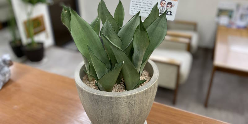 片隅に黒いビニールの苗ポットに入っていたサンスベリアですが、社長がチョイスした鉢に入れ替えてあげました(^-^)