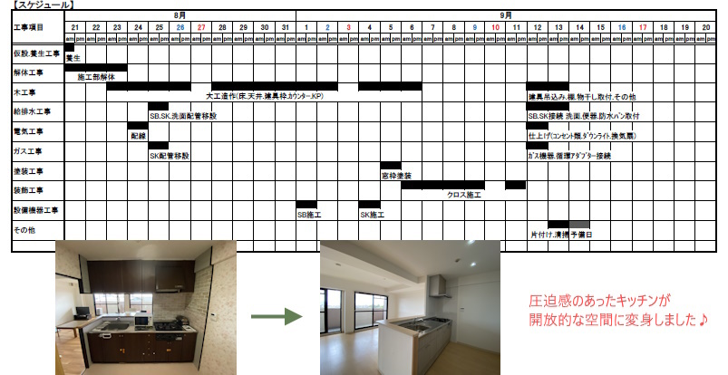 お客様から頂戴したお引越し日、電化製品の搬入等が記載されたスケジュール表に「リフォーム完了デットラインは9/15(金)」と赤く表示された文字を発見し、良い意味でプレッシャーをいただき、目標達成に向けて取り組む事が出来ました(^^♪