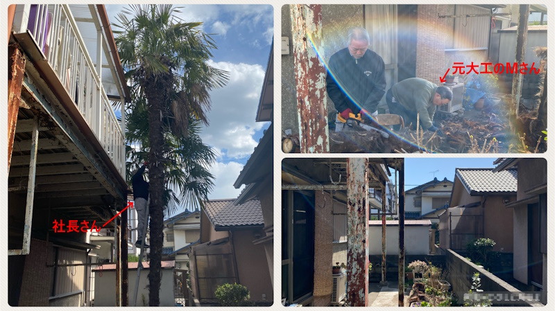 社長は電動ノコギリ。M様は手動ノコギリ。
