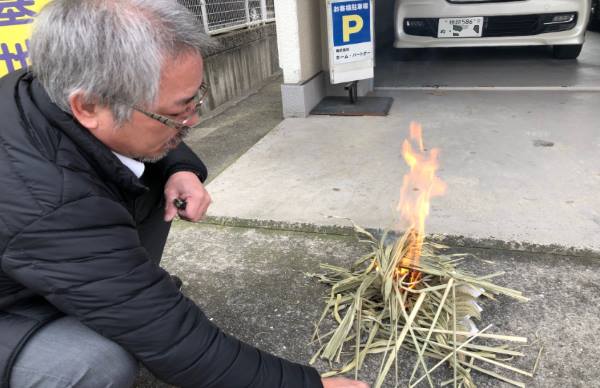 お正月に飾っていた「しめ飾り」を事務所の敷地内で焼き、その火や煙に当たって灰を建物の周りに撒きます。